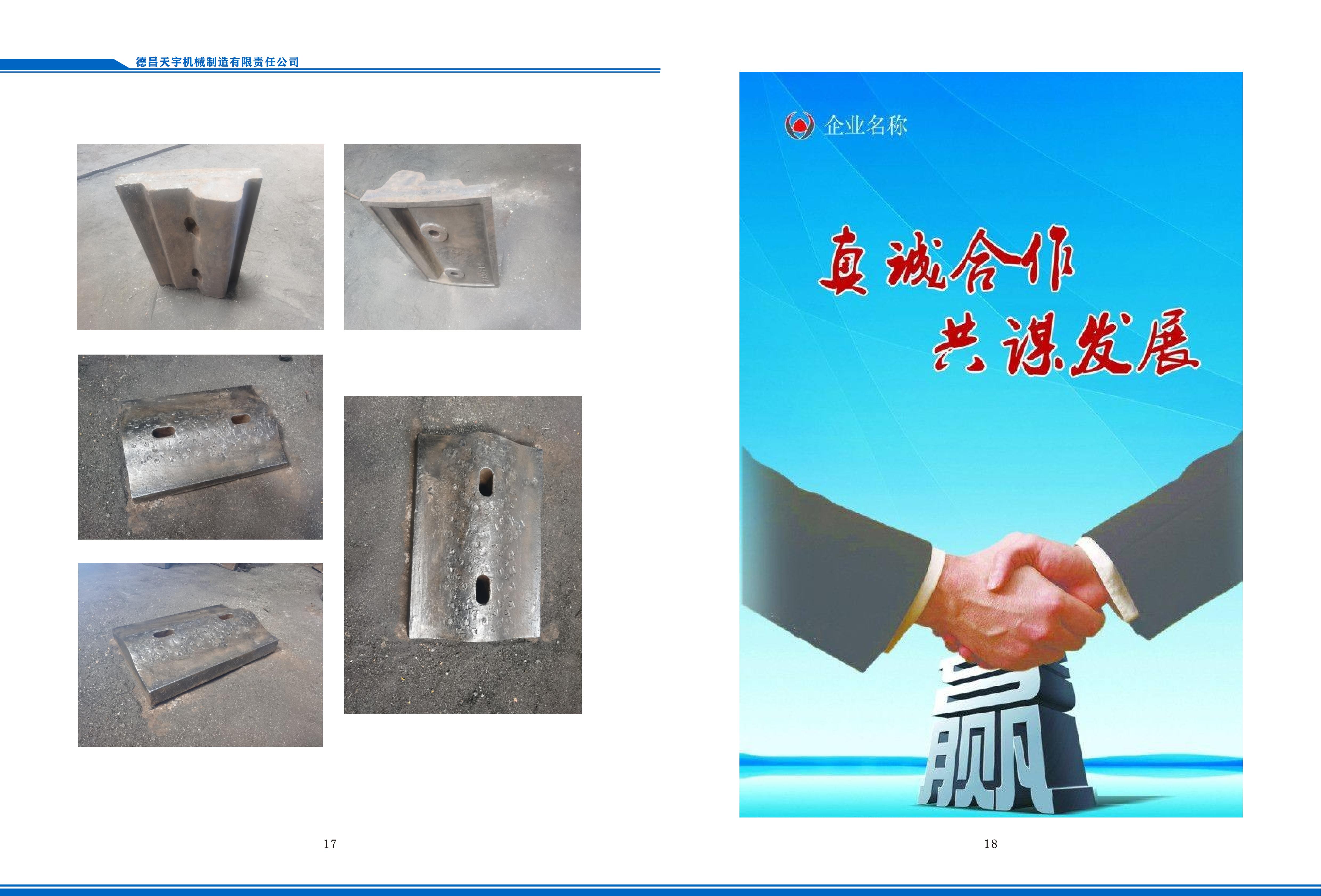 德昌天宇机械制造有限责任公司是一家生产耐磨合金钢的现代化企业,专业生产各种大型铸钢件、高锰钢、超高锰钢、高铬板锤、球墨铸铁、耐热钢、碳素钢、高、中、低铬钢球,钢锻。颚式破碎机齿板、边护板、调整座;反击式破碎机板锤、衬板;锤式破碎机锤头;球磨机的衬板;圆锥式破碎机的轧臼壁、破碎壁;立轴冲击式破碎机(制砂机)周护板、进料管、分料锤以及各种合金锤头、筛条等。为化工、建材、矿山、电力等行业的机械设备提供耐磨、耐热、耐腐的易损件及其它类型的合金铸件、铸球等产品及车床加工。公司占地面积70亩,投资6000多万元,拥有3万多平方米的厂房,年产30000吨,单件生产6吨以下的耐磨件。我公司拥有高级工程师10余人,专业技术骨干100余人,凭借雄厚的技术力量、先进的生产设备、优质的产品质量,特别是使用攀钢含钒、钛的原材料,能够细化晶粒、改变组织结构,提高圆锥机的圆锥壁、破碎壁、扎臼壁使用性能,使产品质量强度提高、韧性好、耐磨性强,深受广大用户好评。使用德国斯派克光谱仪进行炉前炉后检测,配备金相检测设备、探伤仪器和硬度计等进行全面的检测,投资1500多万元上了一条V法生产线,使公司产品,特别是扎臼壁、齿板、复合及双液锤头、衬板等质量又上了一个台阶,现在公司产品畅销四川、浙江、上海、广州、珠海、安徽、重庆、贵州、云南、欧美及东南亚国家。