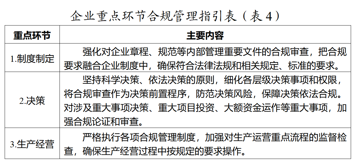 第七条 企业应当围绕自身经营范围,突出业务流程重点环节的合规管理,具体指引见表(4)。