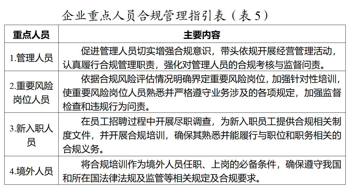 第八条 企业应当围绕自身经营范围,突出重点人员的合规管理,具体指引见表(5)。