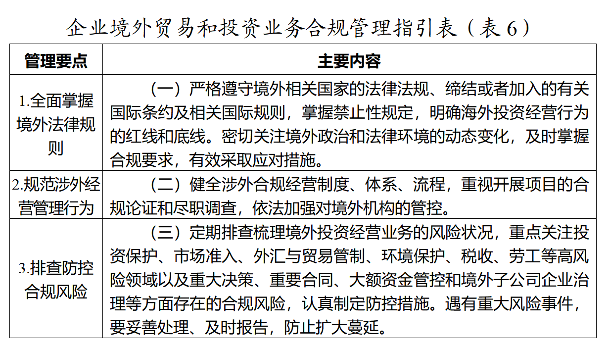 第九条 具有境外贸易和投资业务的企业应当围绕自身经营范围,突出境外贸易和投资业务的合规管理,具体指引见表(6)。
