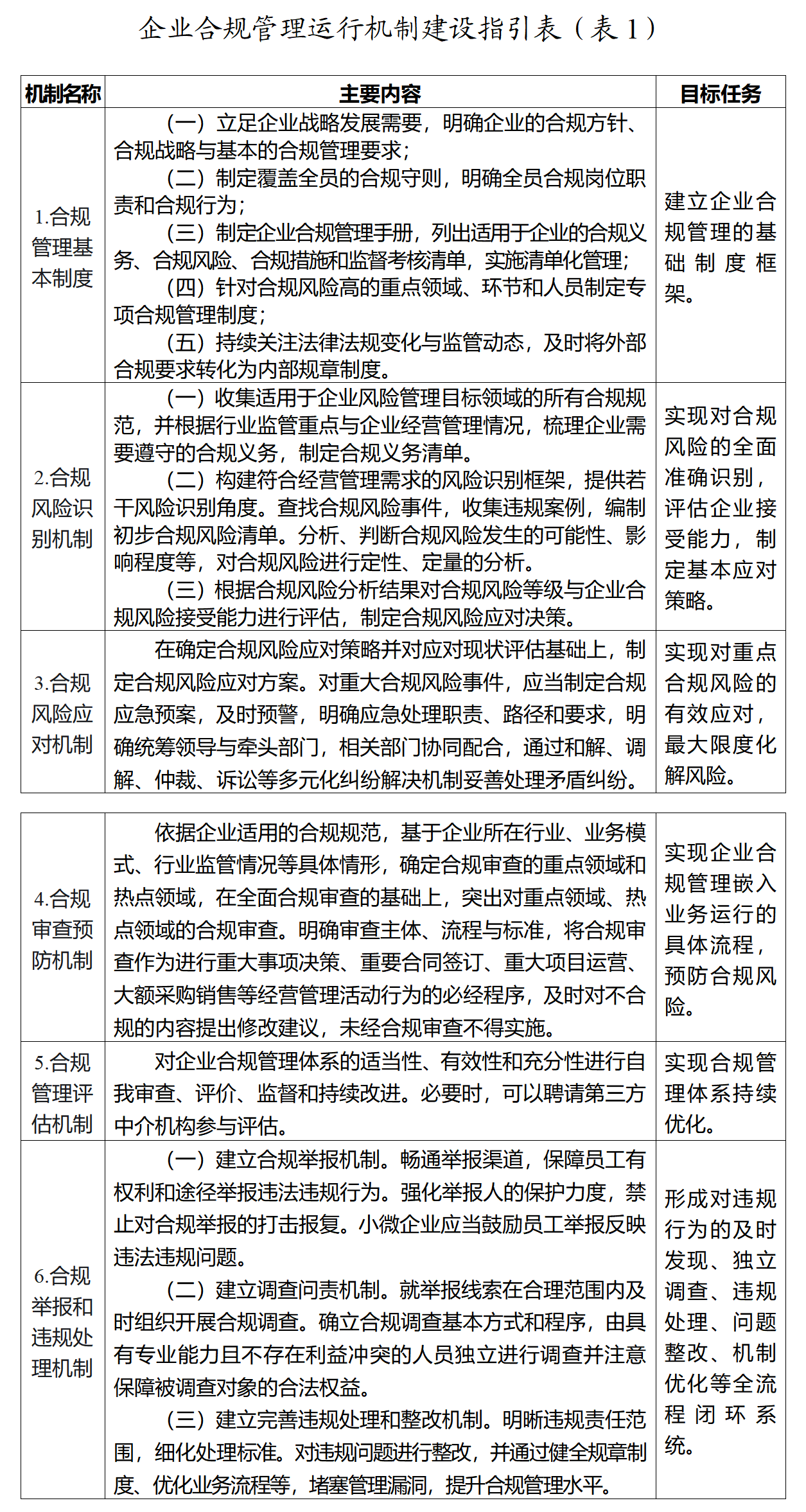 第四条 企业应当结合自身实际,逐步建立完善合规管理制度,主要包括:合规管理基本制度、合规风险识别机制、合规风险应对机制、合规审查预防机制、合规管理评估机制、合规举报和违规处理机制,具体内容见下表(1)。