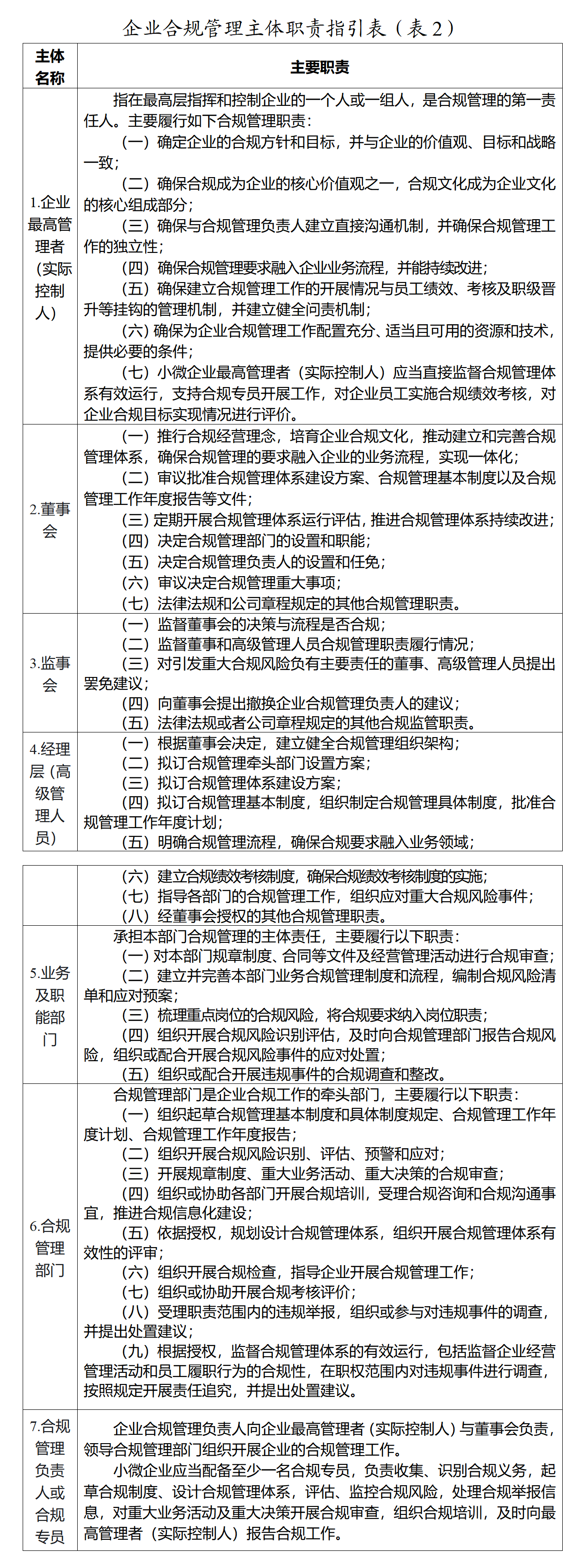 第五条 企业应当基于所在区域、行业及企业类型、业务规模、商业模式等情况,根据相关法律法规、标准规范等要求,搭建权责明晰的合规管理组织架构,并依据规定履行相应职责,推动合规管理制度和运行机制有效落地实施,具体职责指引见下表(2)。