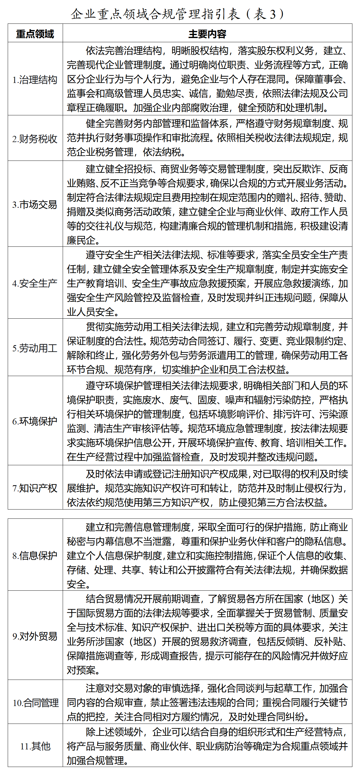 第六条 企业应当围绕自身经营范围,结合合规风险识别评估结果,在全面推进合规管理的基础上,突出重点领域的合规管理,切实防范合规风险,具体指引见下表(3)。