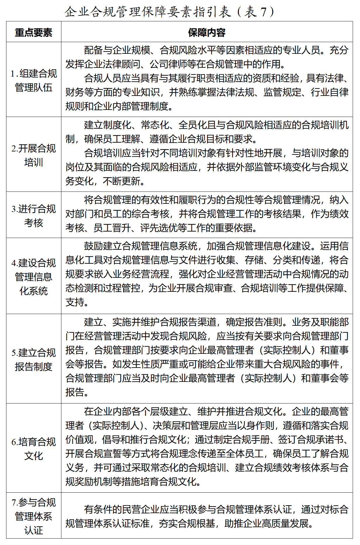 第十条 民营企业应当根据企业自身能力和经营需要,为企业合规管理工作提供包括但不限于人力、物力、财力、专业等方面的必要保障和支撑,确保企业合规管理制度能够有效运行,主要指引见表(7)。